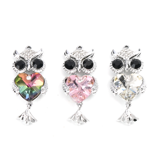 Zinklegierung & Glas Charms Eule Silberfarbe Transparent Herz Schwarz Strass Facettiert