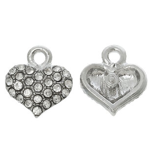 Legierung + Strass Charm Anhänger Herz Silberfarbe Transparent Strass 13mm x 12mm