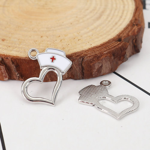 Zinklegierung Charms Hut Silberfarbe Weiß Herz Emaille 20mm x 15mm