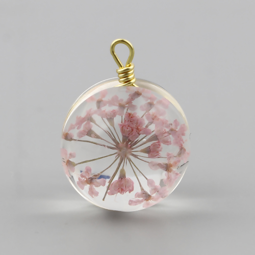 Kupfer + Glas Charms Rund Getrocknete Blumen Vergoldet Rosa 19mm x 14mm1 Stk