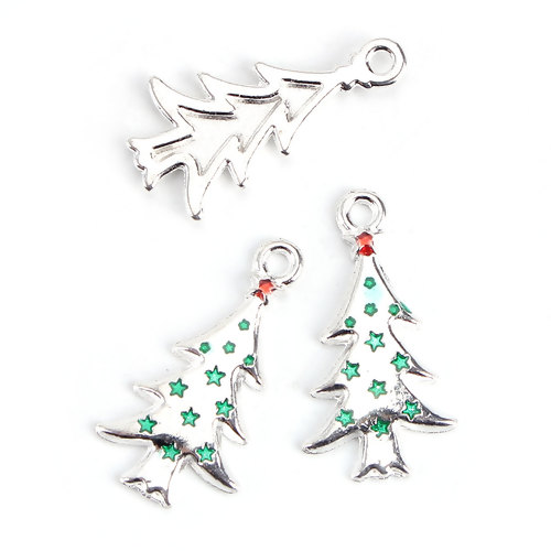 Zinklegierung Charms Anhänger Weihnachten Weihnachtsbaum Silberfarbe Rot & Grün Stern Emaille