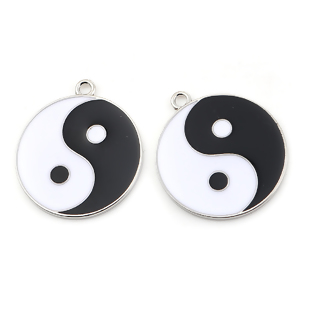 Zinklegierung Anhänger Rund Silberfarbe Schwarz & Weiß Yin Yang Symbol Emaille 45mm x 39mm